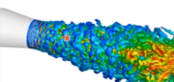 上图展示喷嘴喷射流动的过程,从图中可以观察到涡流是如何形成的,然后他们变大,最后得到拉伸,在流动后方形成新的涡流。