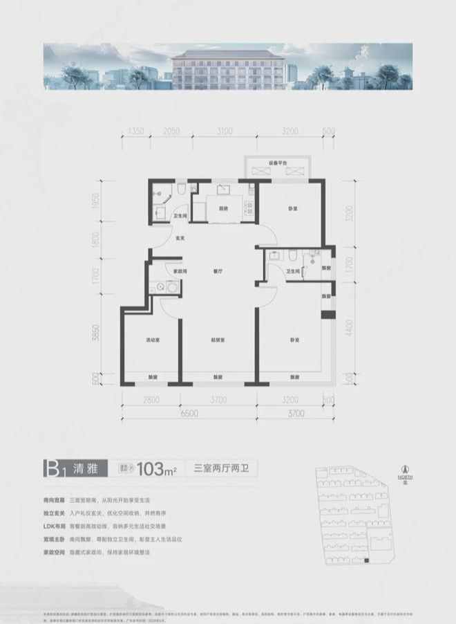 约99㎡三居,南向三面宽+南北通透+全明格局,这也是市面上常规的眼睛户型,中央餐客厨一体。客餐厅等宽,空间上的通透感很好,餐厅旁有独立家政间,还预留了一组餐边柜空间。北侧的设备平台和南向飘窗都是全赠送。加赠送得房率在96.2%左右。